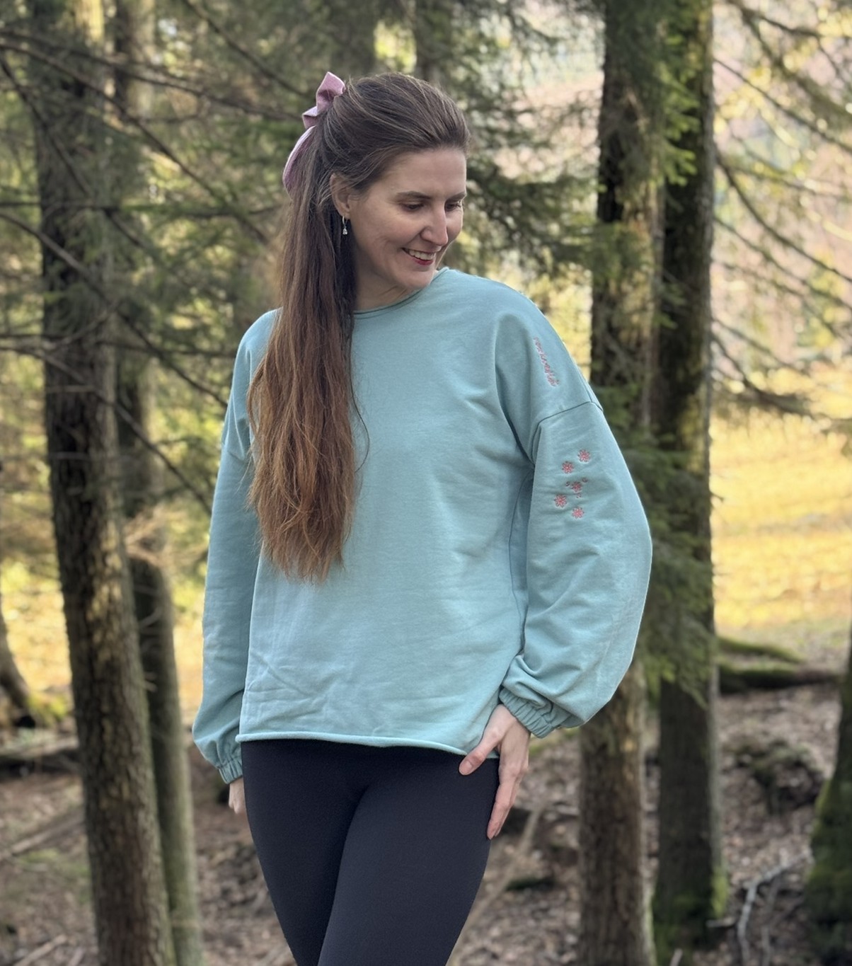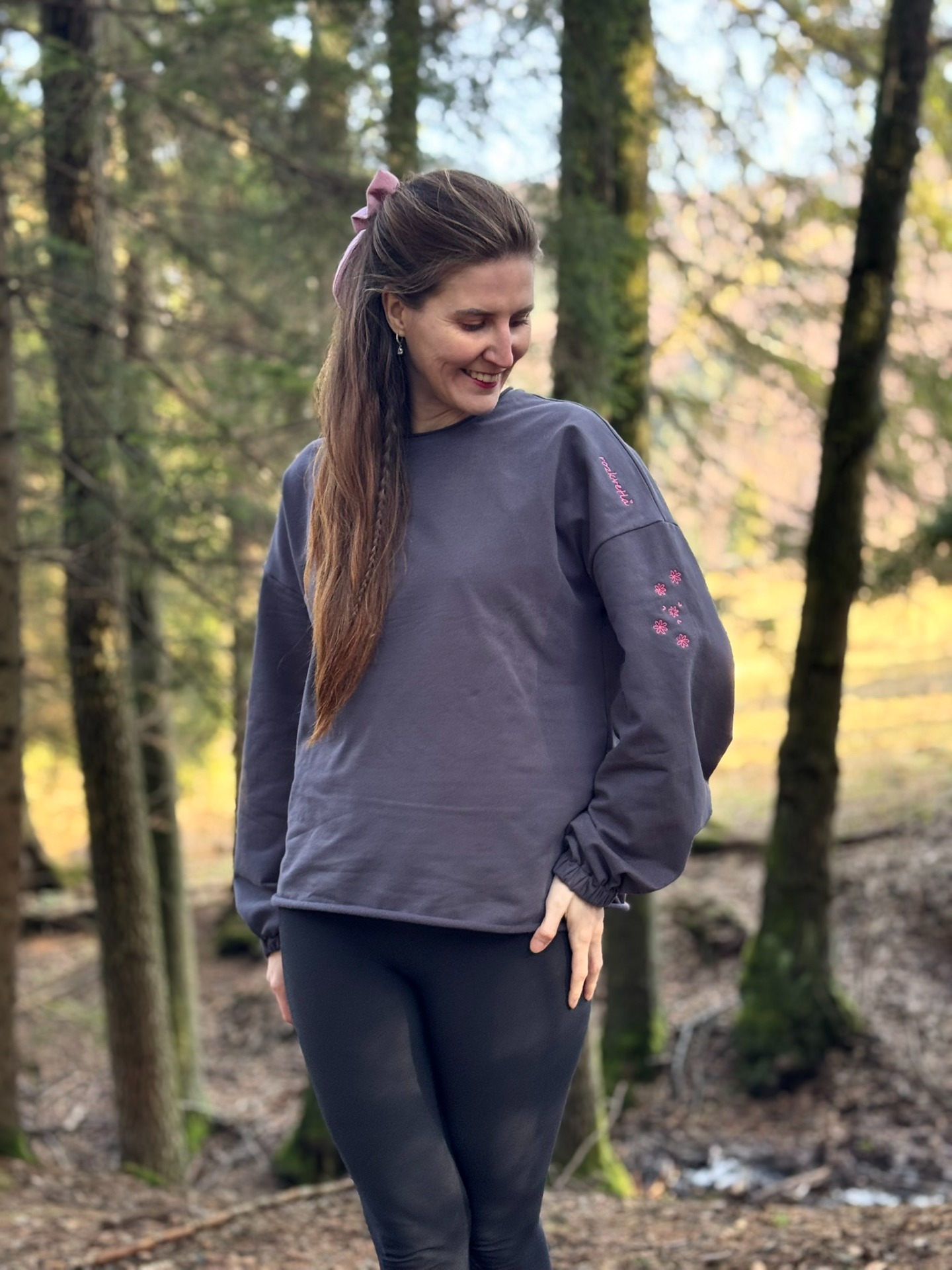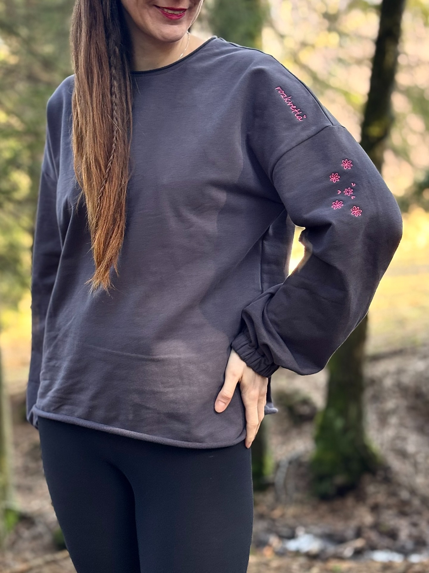- volná mikina, se širokými rukávy staženými do gumičky