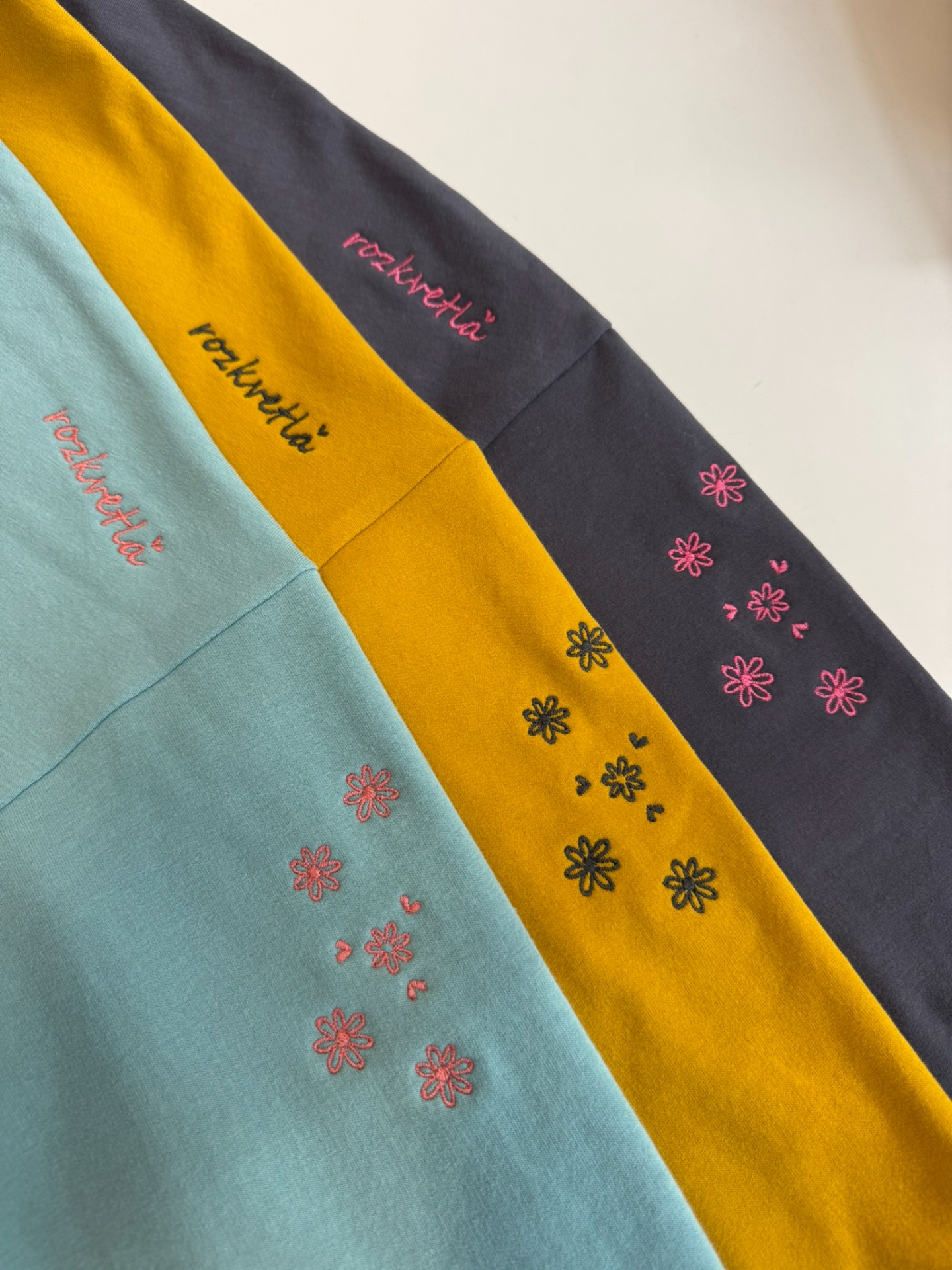 - na levém rameni je vyšito ROZKVETLÁ a na levém rukávu jsou vyšité KYTIČKY