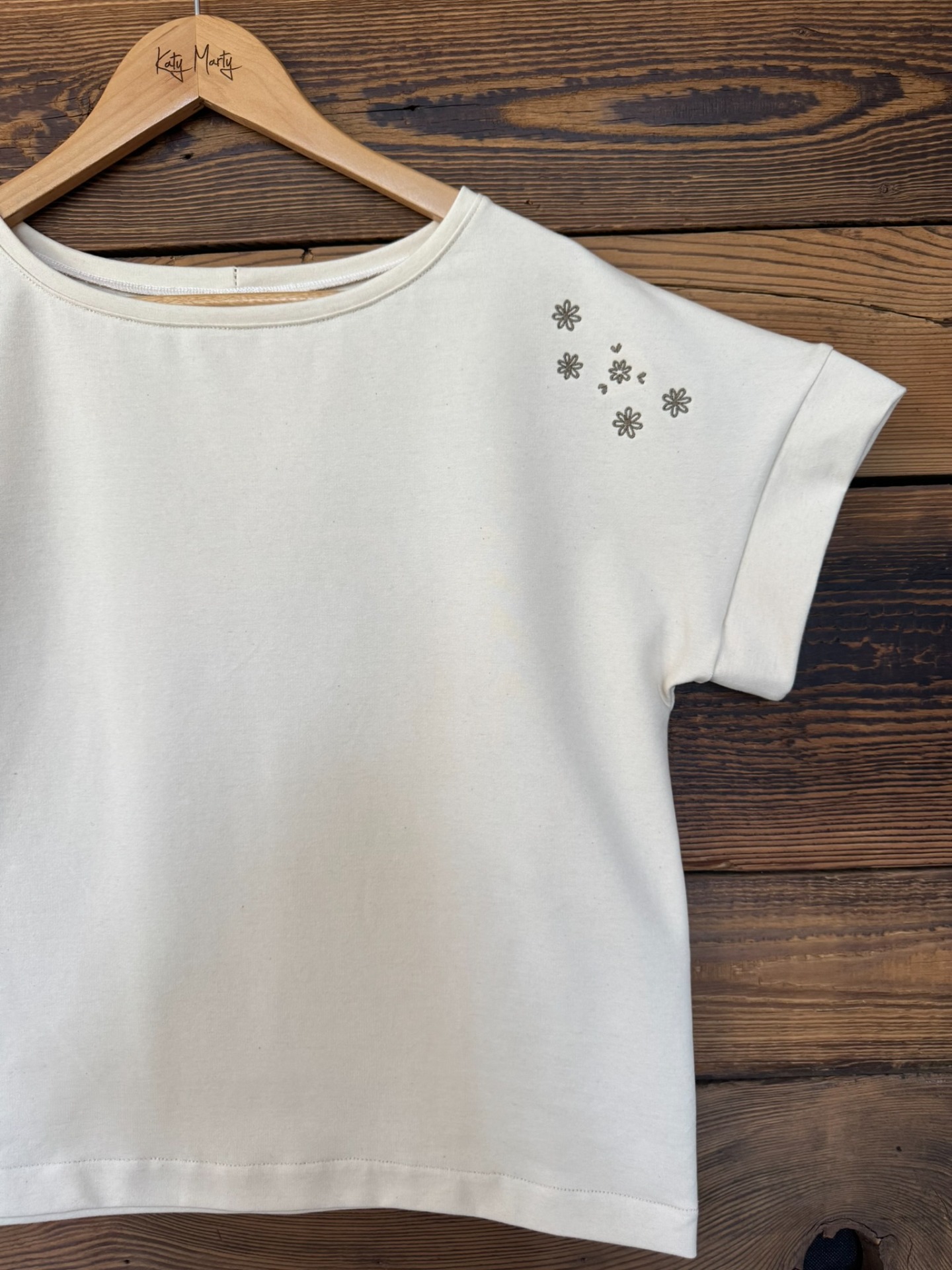 - široké tričko s lodičkovým výstřihem (stejný střih jako tričko miluj)